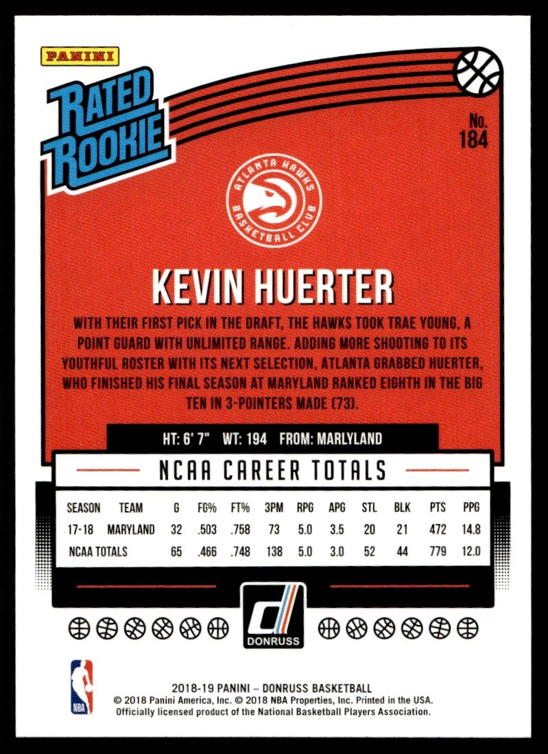 Product Name: 2018-19 Donruss Rated Rookie vente en gros Kevin Huerter Rookie Atlanta Hawks #184